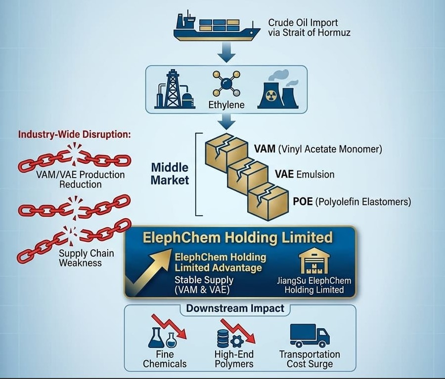 This crisis is rapidly spreading along the oil → ethylene → VAM → VAE supply chain. Due to extremely tight ethylene supply, VAM (vinyl acetate monomer) production is directly constrained by raw material shortages, and its market price is facing the risk of soaring. As the core downstream product of VAM, the supply chain stability of VAE (vinyl acetate-ethylene copolymer emulsion) has been severely impacted. The industry generally expects that as VAM costs are passed on, VAE emulsion prices will inevitably rise. However, against the backdrop of widespread industry-wide operating restrictions and a significant reduction in expected VAE output due to insufficient VAM supply, JiangSu ElephChem Holding Limited is able to provide a stable supply of VAM and downstream VAE products.